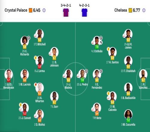 水晶宫首发:1-亨德森、23-坎沃特(65'24-索萨)、2-穆尼奥斯(76'34-里亚德)、3-米切尔(65'10-皮诺 )、5-拉克鲁瓦、26-理查兹、8-莱尔马、20-沃顿、7-萨尔、11-约翰逊(76'19-休斯)、14-马特塔(85'12-乌切)