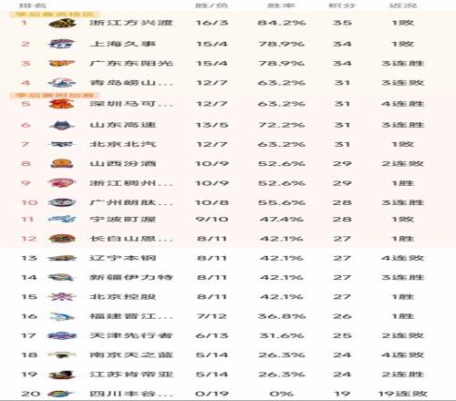 北京时间1月25日,今晚的CBA常规赛第19轮结束了7场比赛,我们看看最新积分榜变动,主要的信息如下:广厦87-93憾负山东,浙江稠州85-82逆转上海,广州80-78险胜青岛,深圳111-88大胜南京,宁波84-86憾负江苏,福建118-82大胜四川,新疆78-59辽宁!