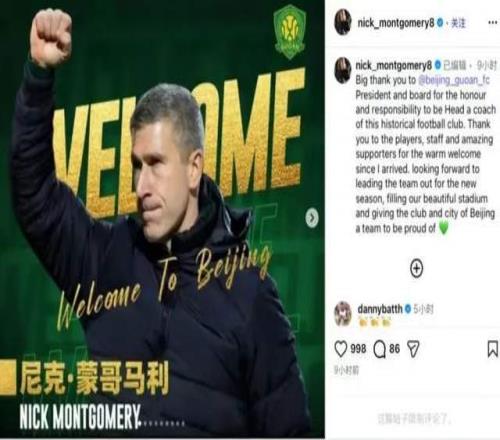 或许正是有了三个得力助手,再加上这段时间对球队的了解,北京国安新任主帅蒙哥马利在社交媒体上对新赛季北京国安的成绩进行了展望,并且充满了信心。在社交媒体上,他写道,“非常感谢国安主席和董事会让我执教这家有着历史底蕴的俱乐部,让我倍感荣幸的同时,也感到责任重大。”此外,他还对球员、教练组和球迷表示了感谢,并直言不讳的表示,自己会在新赛季带领球队用激情点燃主场,让球队成为这座城市的骄傲。