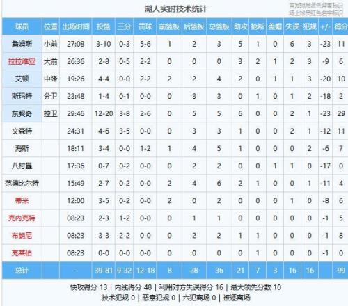 湖人:东契奇29分5板6助、詹姆斯11分3板5助、文森特11分3板1助、艾顿10分4板2助、布朗尼8分2板1助、海斯7分5板1助、蒂米6分2板、拉拉维亚6分3助2断