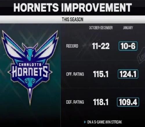 黄蜂最近 16战11胜 , 更恐怖的是他们进攻端的蜕变,1月份进攻效率&净效率联盟第1,还轰出了联盟第1的3分球,抢下了联盟第2的篮板率, 令东西部球队触目惊心。