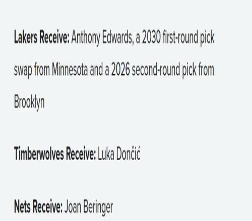 湖人得到:爱德华兹、森林狼2030年首轮签互换权、篮网2026年次轮签