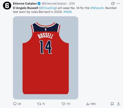 一天之前,球衣号码博主透露,丹吉洛-拉塞尔在奇才的球衣号码是14号,上一位在奇才穿14号球衣的是伯纳德。