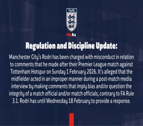 2月13日宣,英足总发布了一条重要的公告,关于曼城球员罗德里在与热刺比赛后的采访内容。罗德里被指控在赛后言论中表现不当,他需要在2月18日之前对此进行回应。