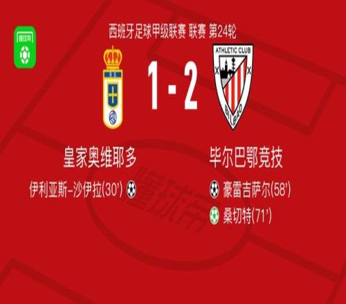 北京时间2月15日西班牙足球甲级联赛 联赛 第24轮,皇家奥维耶多主场对阵毕尔巴鄂竞技。皇家奥维耶多伊利亚斯-沙伊拉破门。毕尔巴鄂竞技豪雷吉萨尔破门,桑切特破门。最终比分皇家奥维耶多 1-2 毕尔巴鄂竞技。