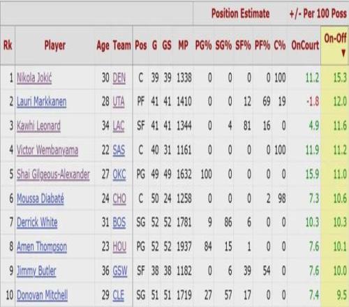 本赛季NBA球员on-off值(在场与离场时百回合正负值的差值),前五名如下:1、约基奇,15.3;2、马尔卡宁,12;3、伦纳德,11.6;4、文班亚马,11.2;5、亚历山大,11。没想到吧?马尔卡宁居然能排联盟第二!