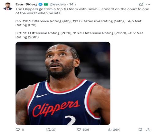 根据《福布斯体育》记者埃文-斯迪瑞最新的消息,本赛季的伦纳德算是独扛快船,卡哇伊在场时快船进攻效率118.1(联盟第四),不在场时进攻效率110(联盟28)。