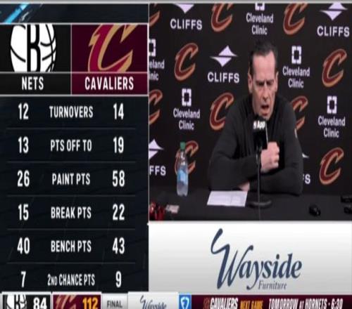 下半场哈登再次靠传球带动球队,内线莫布里和阿伦持续吃饼护框,骑士领先达到40分。哈登再也不用像快船时那样被狠槽,他竟然提前打卡下班了。全场骑士7人得分上双,简直是完美的团队篮球。米切尔17分,哈登16分5板9助3断,阿伦15分10板,莫布里复出拿10分9板,施罗德12分3助,泰森11分,韦德11分5板。其中首发正负值方面,哈登+25,米切尔+37,阿伦+31,莫布里+20,韦德+28。