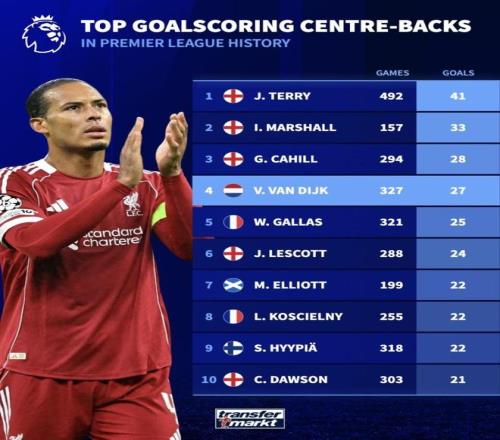 最近利物浦客场踢桑德兰,范戴克用一次角球后的头球把比分定在1-0,这球还让他在英超的利物浦队史后卫进球数上完成反超,成了队内英超进球最多的后卫之一。接着再看这份“英超历史进球最多的中后卫”数据:范戴克327场27球,放在中后卫里已经属于很能进的类型,但马歇尔157场33球这种产出强度摆在那儿,同样是中后卫里范戴克进球很厉害了,但相对马歇尔就是小巫见大巫。