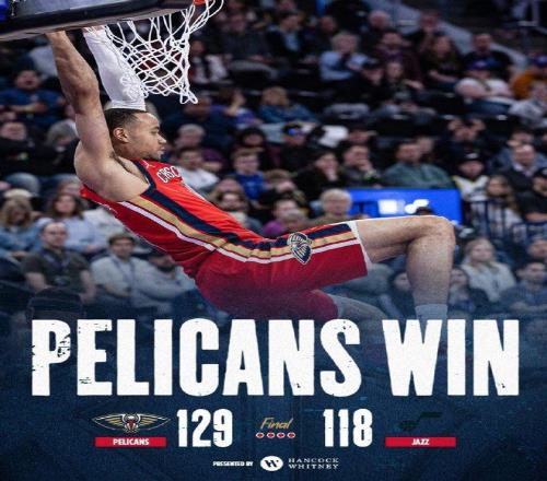 中场休息回来,鹈鹕第三节25-27输掉2分,第四节26-30再输4分,最终鹈鹕129-118战胜爵士收获3连胜,爵士遭遇4连败。
