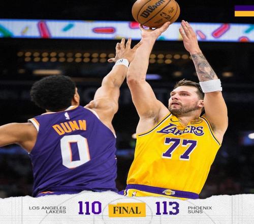 NBA常规赛继续进行,洛杉矶湖人队(34胜24负)继续连败。虽然东契奇得到41分、8个篮板和8次助攻,他率队第四节化解两位数落后追平,但奥尼尔投中三分准绝杀,里夫斯错失扳平三分,湖人队在客场以110-113不敌菲尼克斯太阳队(34胜26负)。太阳队结束2连败,湖人队遭遇3连败。