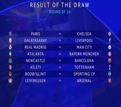 经过2天比赛的争夺,本赛季欧冠淘汰赛附加赛已经结束了全部比赛的角逐;马竞、博德闪耀、勒沃库森、纽卡、亚特兰大、大巴黎、皇马、加拉塔萨雷在内的八家俱乐部击败了各自的对手,成功跻身淘汰赛。与此前获得前八的8队组成了本赛季的欧冠16强;北京时间2月27日晚,欧冠淘汰赛抽签仪式在瑞士尼翁的欧足联总部进行,经过抽签之后,诞生了皇马VS曼城、大巴黎VS切尔西、巴萨VS纽卡斯尔3组重磅对决。