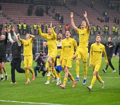 2月24日,博德闪耀队球员在本赛季欧冠淘汰赛附加赛战胜国际米兰队后庆祝。新华社发