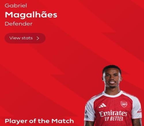 最终经过英超官网球迷投票,加布里埃尔以59%的得票率当选全场最佳球员。
