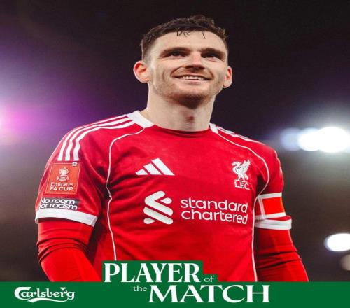 利物浦官方宣布,后卫罗伯逊当选足总杯客战狼队一役队内最佳球员。