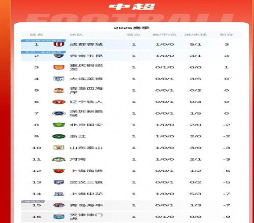 2026赛季的中超联赛战火重燃,目前16支球队都已经结束了首轮较量,除了天津津门虎与升班马重庆铜梁龙0:0握手言和,其他7场比赛都有进球入账,其中成都蓉城更是用残暴的5:1迎来赛季首胜。那首轮比赛战罢,各支球队目前的积分如何?本赛季哪支球队又有望成为争冠热门呢?