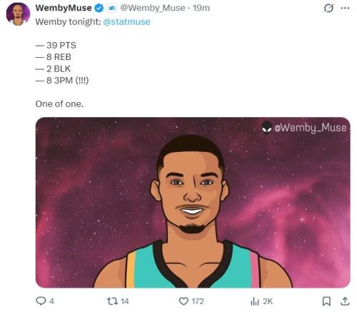 此役文班亚马是完胜塔图姆,他全场比赛36分钟,20中11,三分15中8,罚球12中9,拿到39分11篮板3助攻1抢断2盖帽6失误,命中率55%,三分命中率53.3%,真实命中率77.1%,正负值+5。