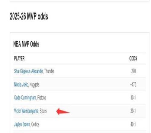 目前文班亚马的MVP赔率仅仅排在第四位,可本赛季文班亚马不管是面对SGA、约基奇、坎宁安都是碾压的存在。