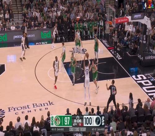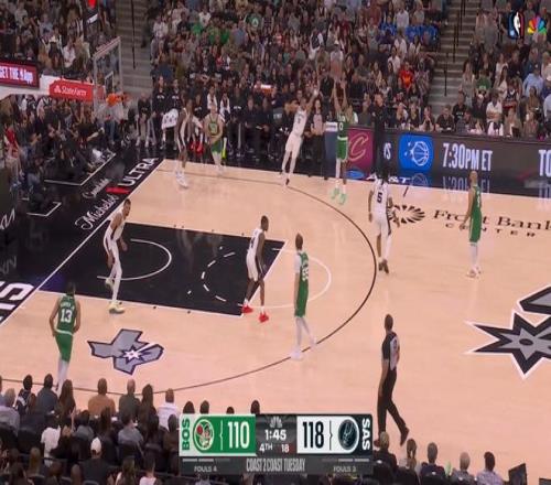 ——剩下41秒前,还是与文班亚马挡拆,强突凯尔特人三人防线,上篮打进,还造成犯规(加罚没进),这一球可以说杀死了比赛