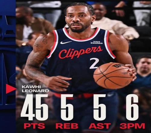 45分追平了伦纳德的生涯第二高分(此前曾两次拿到过45分),同时这也是伦纳德本赛季的第5次40+,此前他曾单场拿过55分、45分、41分、41分。