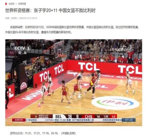 新华网:《世界杯资格赛中国女篮不敌比利时队》2026年3月13日新华社新闻:《宫鲁鸣:中国女篮要通过与世界强队交手提升水平》2026年3月12日央视网:《世界杯资格赛:张子宇20+11 中国女篮不敌比利时》2026年3月12日
