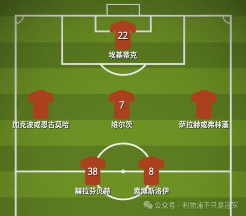 本场坐镇主场对热刺,攻坚将是首位,首发选择会更有攻击性,我认为可以让索博斯洛伊与赫拉芬贝赫搭档双后腰,维尔茨从左路回到前腰,左路上一个边锋,也就是如下配置: