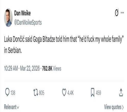 赛后采访中东契奇再次确认这一说法:“他用塞尔维亚语朝我说我C你全家(he’d fuck my whole family),我真得忍受不了了。”