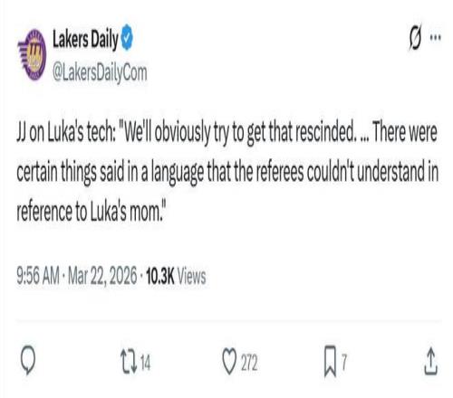 赛后湖人主帅雷迪克也给出相同说法,表示是对手比塔泽用裁判听不懂的话(塞尔维亚语)说了一些关于东契奇妈妈的话,球队肯定会想办法努力撤销这一次吹罚。