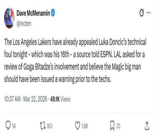 ESPN名记Dave McMenamin跟进曝出,湖人队已经向联盟提交上诉,要求对比塔泽行为进行复查的同时,认为裁判在吹罚T之前应当先警告。