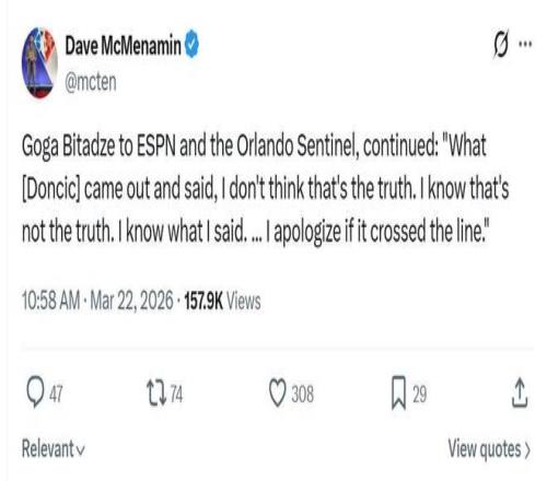 面对湖人与东契奇的这番说法,作为事件另一位主人公的比塔泽公开表示东契奇在说谎,是后者先辱骂了自己的家人,自己只是用同样的话回击。