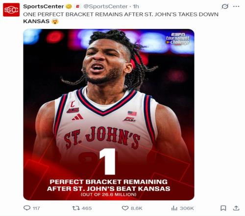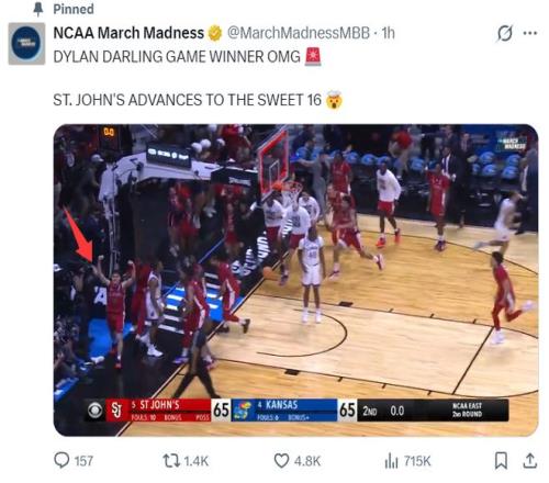北京时间3月23日,NCAA疯狂三月锦标赛32进16强,圣约翰大学67-65击败堪萨斯大学晋级16强。要知道堪萨斯大学是四号种子,圣约翰大学完成了奇迹一战,这是他们队史1999年来首次进入甜蜜16强,换言之就是27年的纪录。