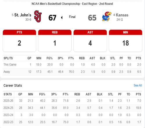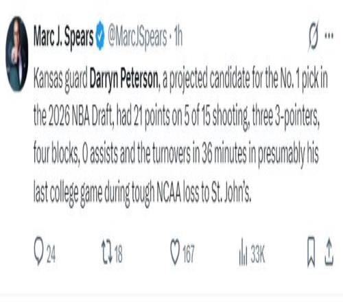 NBA记者马克-J-斯皮尔斯谈到这场比赛,堪萨斯大学后卫彼得森预计是2026年NBA状元热门,但在NCAA16强赛被圣约翰大学爆冷,他15中5拿21分3失误0助攻,这可能是他大学生涯最后一场。