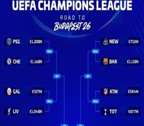 德转列欧冠16强对阵身价:阿森纳与勒沃库森相差8.5亿欧
