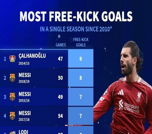 2010年以来单赛季任意球进球榜:梅西三度上榜,索博4球第22