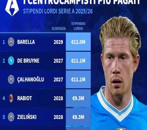 意甲中场税前年薪前10:巴雷拉1200万第1,丁丁、恰20并列第二