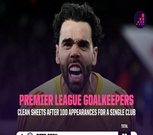 门将代表单一球队前100场英超零封榜:拉亚43次并列第六