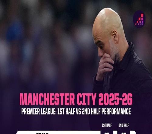 若本赛季英超只算上半场成绩,曼城将以13分优势领跑