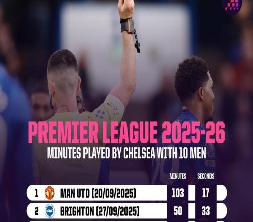 切尔西本赛季英超十人作战累计330分37秒,为所有球队最多