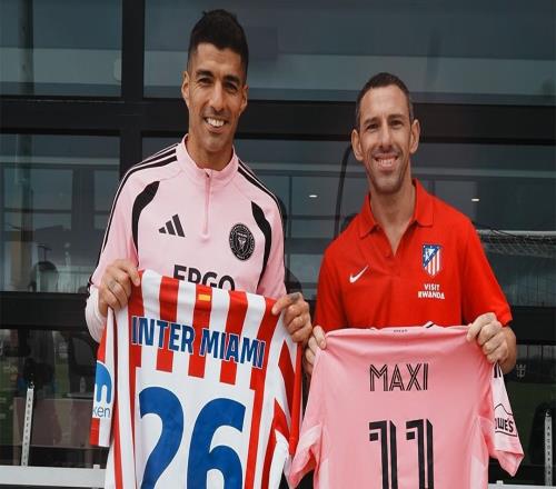马竞在迈阿密举办活动,马克西与苏亚雷斯合影留念