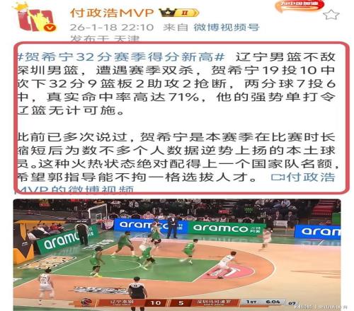 赛后,著名媒体人付政浩发文,对贺西宁的表现大加赞扬“辽宁男篮不敌深圳男篮,遭遇赛季双杀,贺希宁19投10中砍下32分9篮板2助攻2抢断,两分球7投6中,真实命中率高达71%,他的强势单打令辽篮无计可施。此前已多次说过,贺希宁是本赛季在比赛时长缩短后为数不多个人数据逆势上扬的本土球员。这种火热状态绝对配得上一个国家队名额,希望郭指导能不拘一格选拔人才。"。