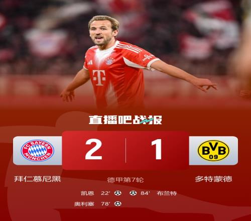德甲第7轮,拜仁2-1多特蒙德拿下德国国家德比,凯恩、奥利塞进球。